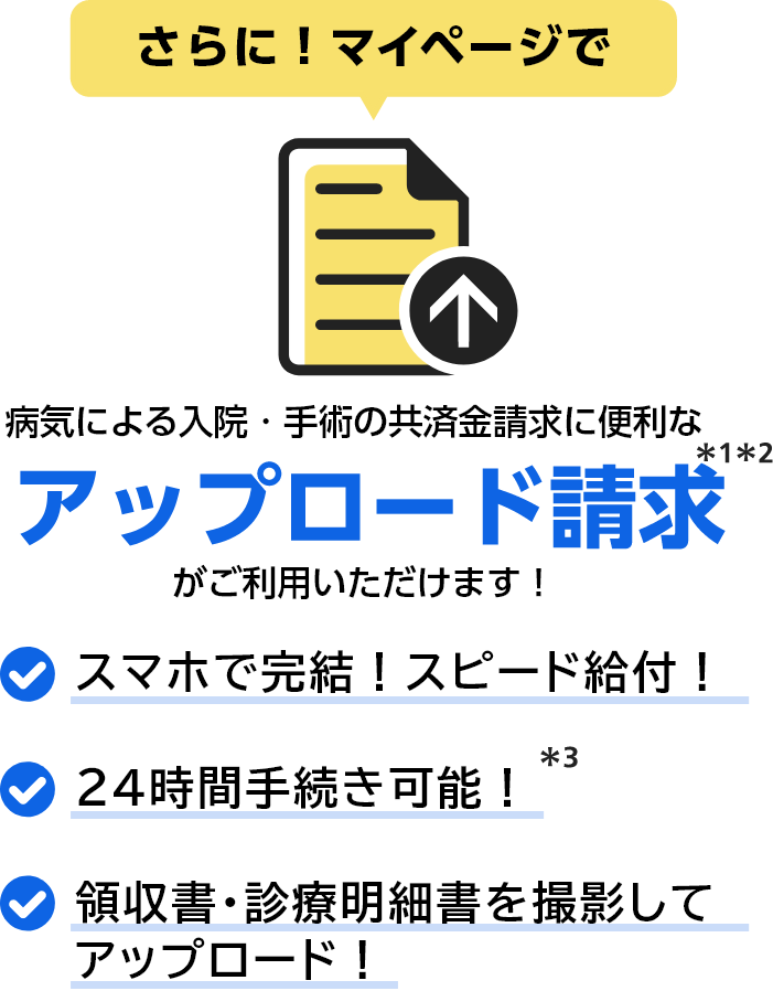アップロード請求とは、ご加入状況やご請求内容により、必要書類をアップロードすることで共済金をご請求いただけるサービスです。