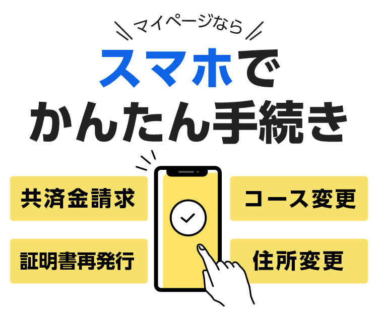 マイページとは、当共済にご加入いただいている方が、インターネットでご自身の情報を確認したり、各種変更手続きや証明書等の再発行、共済金請求を行えるサービスです。